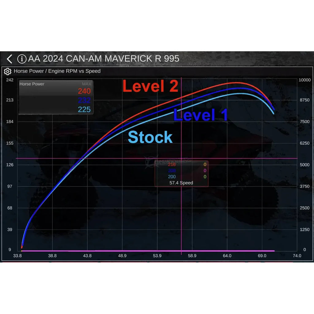 • Level 3 - 91-93 Octane - 240 RWHP / 260-270 crank HP:  Our Level 3 tune is again designed for 91-93 octane and is very safe. This gains 17-20 RWHP in the mid-range.  This tune is absolutely nuts for being able to run on a bone stock Maverick R.  Peak boost is around 23-25 PSI (+2-3 PSI), and settles down to roughly 22-23 PSI.   Our blow off valve kit is recommended.  This tune will work great with stock exhaust but even better with aftermarket exhaust.