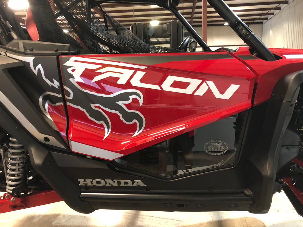 Trail Amor's Door Inserts for the 2019 - 2022 Honda Talon 1000X, Talon 1000R, 2021 - 2022 Talon 1000R Fox Live Valve, Talon 1000X Fox Live Valve are made from either a 1/4" polycarbonate with mar-resistant coating on both the interior and exterior OR 1/4" solid black plastic. The polycarbonate option allows a clear view to watch your wheel placement while rock crawling while keeping mud and debris from entering the cab! If you need to close this gap but don't need a visual reference for technical rock crawling, the black option is a cost effective way to achieve this. Includes mounting hardware and detailed photo-documented instructions.