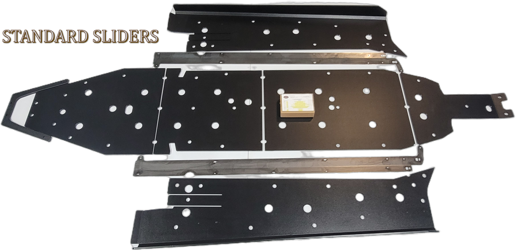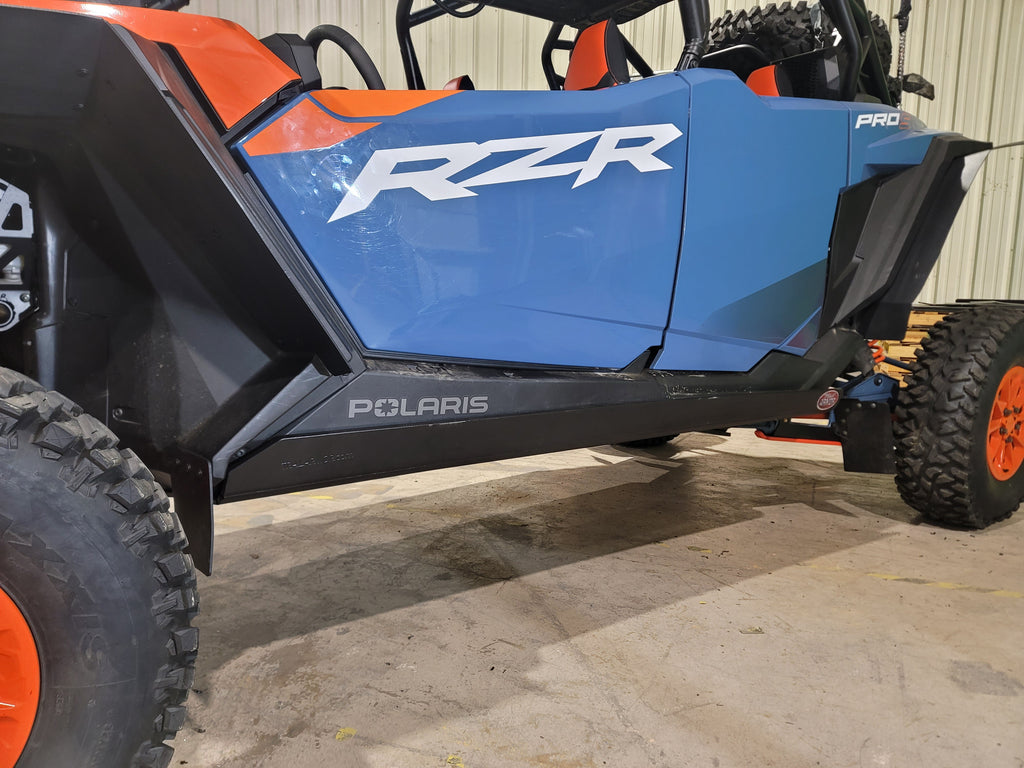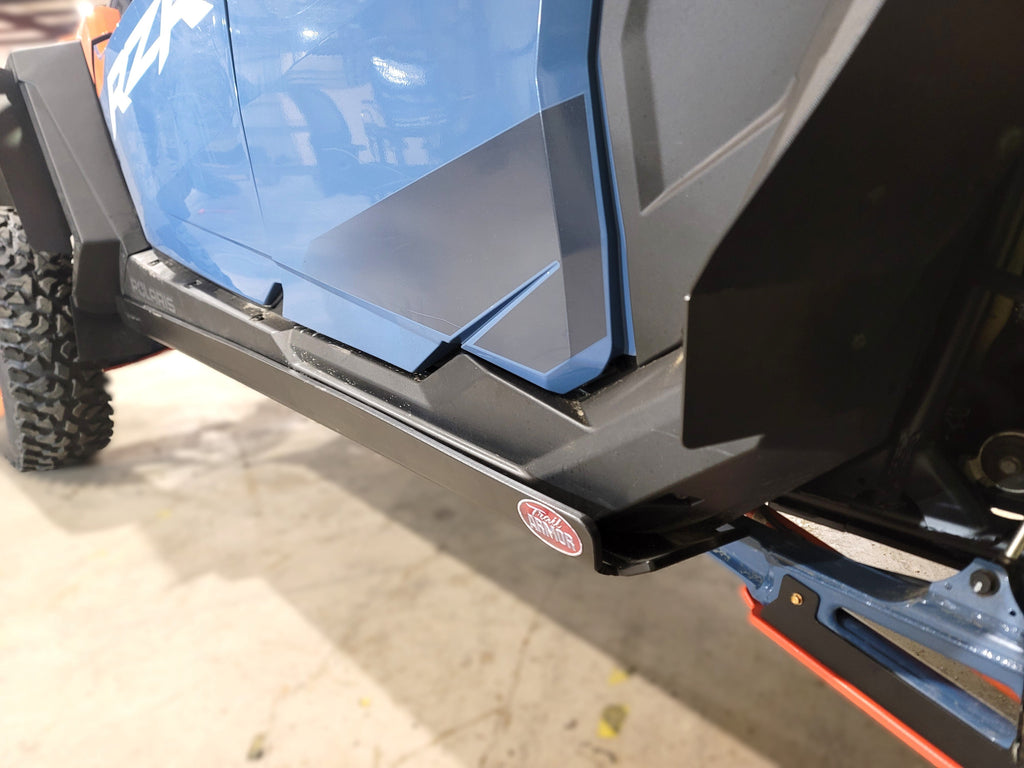Protect your 2022 - 2024 Polaris Turbo R 4 and 2025 Pro S 4 with Trail Armor’s full skid plate set, crafted from 1/2" super tough polymer. These skids offer excellent shock absorption, long-lasting surface durability without rust, and are lighter than metal counterparts. Drain holes are positioned to let debris wash away easily without removal. The kit includes multiple sections covering the underside, including front and rear differentials, with access points for servicing grease fittings and oil drains. Choose between Standard Sliders for extended rocker panel coverage or Trimmed Sliders, compatible with Pure Polaris Rock Sliders. Installation hardware and instructions are included. Some factory hardware may be reused. Shipping is via UPS ground with applicable large package fees. Color options are special order and non-returnable. These sliders do not feature any engraving—the included tri-color image illustrates the color contrast. Front A-arm Guards, Trailing Guards and Mud Flaps displayed here are available for purchase separately. Refer to Product #'s TA012ARMIMPFG-PROR, TA012IMPTAG-TURBOR, TAMFFE-PROS-FC or TAMFFE-PROXP for details. Consult the Fitment Guide for exact vehicle compatibility.