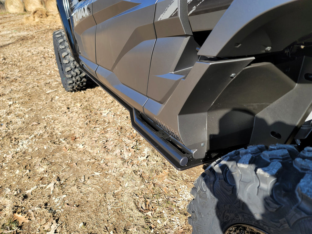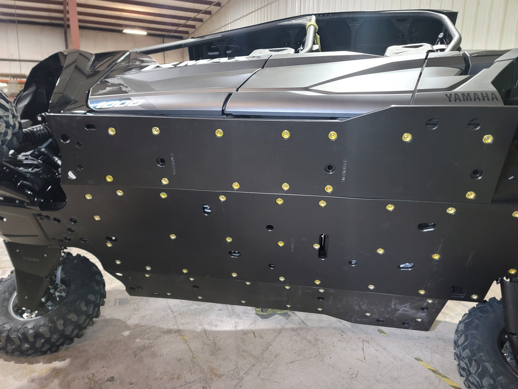 Get the best in under vehicle protection with Trail Armor's full skid plate set for the 2025 Yamaha Wolverine RMAX4 1000 X-TR, and RMAX4 Limited Edition. Will not fit the RMAX4 Compact. See part number TA012FULLSKID-YW-RMAX4COM. Made from Super Tough polymer, these 1/2" plastic skids are lighter than most traditional metal/aluminum skid plates and because they have no "impact memory", they absorb shocks to the bottom of your vehicle without the dents, galling and corrosion of metal/aluminum skids. Additionally, these skids for the RMAX4 are designed side panels that extend approximately a 1/2" past the rocker panels to protect the vulnerable sides and rocker panels of your vehicle. Compare Trail Armor's skid set coverage with other skid manufacturer's like items - slider nerfs are either sold separately or the bottom skid coverage ends before the rocker panel, leaving this part of your vehicle unprotected. Trail Armor's skid plates come in easy to install panels. They install directly over the existing metal factory skid plate. Access holes to service points and oil drains make maintenance a breeze. Strategically placed drain holes allow dirt and debris to wash out - you don't have to remove them to clean out the belly your vehicle. However, if needed, individual panels may be removed to access different areas without removing the entire skid plate. Recessed mounting holes protect fasteners from damaging blows and keeping all bolt heads from protruding the skid's surface. All kits come with corrosion resistant hardware and photo-documented installation instructions. Installation videos, if available, are provided as a YouTube video on our site. A-Arm guards and bash plate if shown installed in pictures are not included with this skid set but are sold separately. See part numbers TA011ARMIMP-YW-RMAX2 and TA-YW-RMAX-BASH. Colors are not matched to any OEM graphic package. Colors are considered a special order and are non-returnable.
