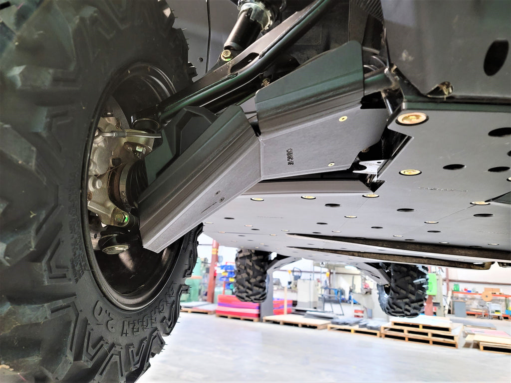 Break bad on the trail, ride the most buggy-busting terrain you can find - Trail Amor's a-arm guards for the Can Am Defender 6x6 can take the iMPACT! WILL FIT THE FACTORY ARCHED A-ARMS OF THE LISTED MODELS ONLY ON ALSO FITS CHART IN GALLERY. WILL NOT FIT STRAIGHT A-ARMS. CAN AM HAS TWO VERSIONS (TWO DIFFERENT PART NUMBERS) OF ARCHED A-ARMS. IF THE MACHINE IS NOT ON THIS LIST, THESE GUARDS WILL NOT FIT. AGAIN PLEASE SEE ALSO FITS CHART IN GALLERY FOR SPECIFIC FITMENT! Made of the same 1/2" Super Tough material we make our skid plates out of, these are by far the toughest, best designed and coolest a-arms on the market. Guards have three sided protection of your front and rear CV boots - front, rear and bottom - and mount easily with no drilling required. All mounting hardware and simple photo-documented installation instructions are included. These front A-arm guards are not large enough to engrave upon and so have a Trail Armor logo sticker. Picture of tri-colored guards below are to show what the colored edges will look like. Colors are considered a special order and are non-returnable.