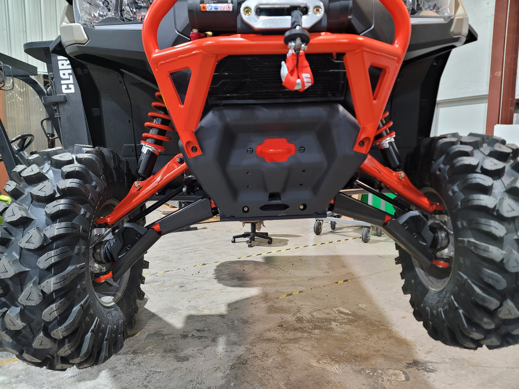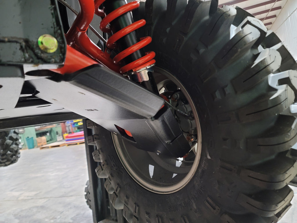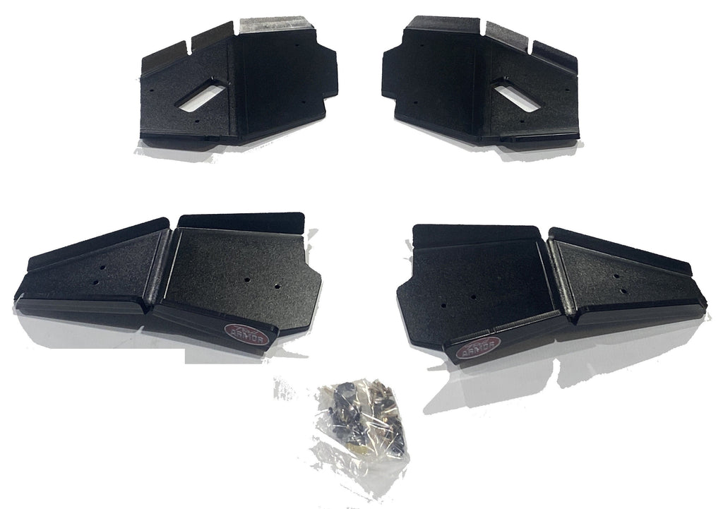 Break bad on the trail, ride the most buggy-busting terrain you can find - Trail Amor's a-arm guards for the Can Am Defender, Defender X MR, Defender Max, and Defender Pro can take the iMPACT! Made of the same 1/2" supertough polymer we make our skid plates out of, these are by far the toughest, best designed and coolest a-arms on the market. Guards have three sided protection of your front and rear CV boots - front, rear and bottom - and mount easily with no drilling required. All mounting hardware and simple photo-documented installation instructions are included. WILL ONLY FIT THE FACTORY ARCHED A-ARMS OF THE MODELS LISTED ON THE ALSO FITS CHART IN THE GALLERY, WILL NOT FIT STRAIGHT A-ARMS. See TA011ARMIMP-CAD-ARCH for the other ARCHED A-ARM Fitment. These front A-arm guards are not large enough to engrave upon and so have a Trail Armor logo sticker. Picture of tri-colored guards below are to show what the colored edges will look like. Colors are considered a special order and are non-returnable.