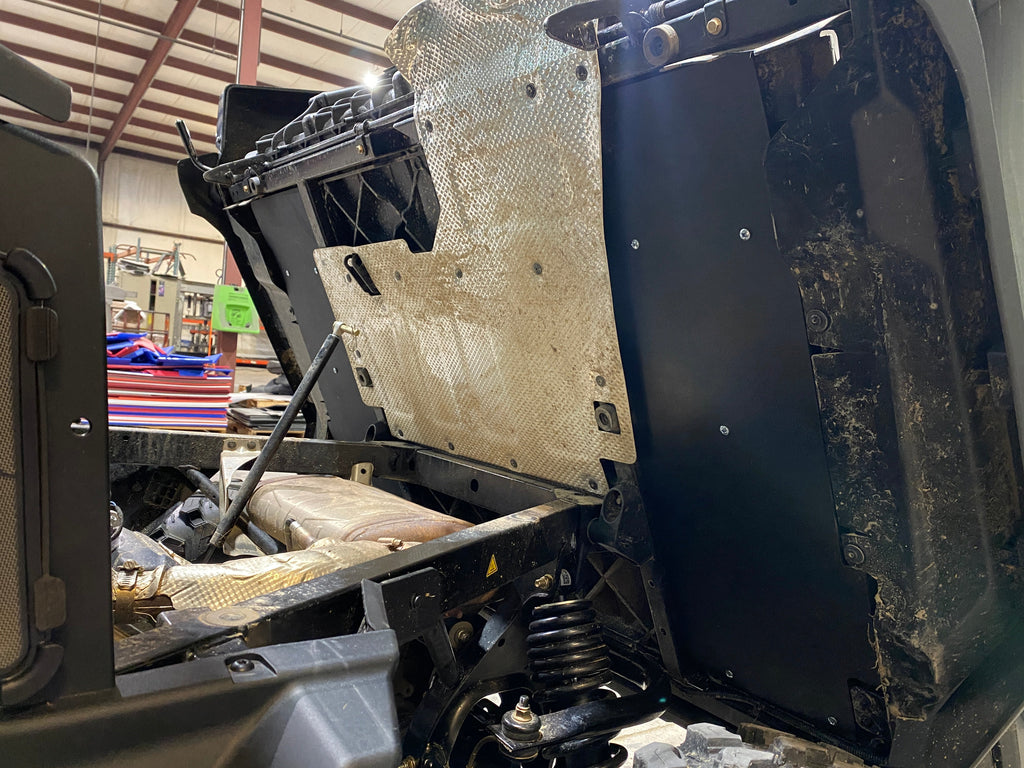 Tired of your tires caking mud in that impossible-to-clean honeycomb under your Can Am Defender and Defender Max's dump bed? Trail Armor's under bed mud shields fit over those problem areas on the underside of your bed above the tires to keep the mud out. Made from 1/8" (.125") thick plastic, these panels are custom cut to fit on your bed underside (above the tires) and will not interfere with dumping capability or function of factory heat shield. Please see ALSO FITS for specific year and model fitment.