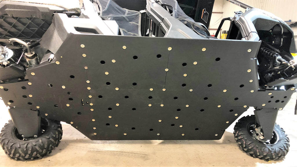 Get the best in under vehicle protection with Trail Armor's full skid plate set for the 2018 - 2025 Can Am Defender Max, Defender Max XT, Defender Max XT Cab HD10, Defender Max X MR HD10, Defender Pro DPS HD10, Defender Pro XT HD10, Defender Max HD7, Defender Max HD9, Defender Max DPS HD9, Defender Max XT HD9. Made from 1/2" supertough polymer, these skids are lighter than most traditional metal/aluminum skid plates and because they have no "impact memory", they absorb shocks to the bottom of your vehicle without the dents, galling and corrosion of metal/aluminum skids. Trail Armor was the first in the industry to design skids with the formed leading edges (front and rear) featured on our skid plates. These leading edges protect vulnerable frame edges and wheel wells from blunt edge impacts and act as a starting edge to slide over obstacles without the resistance and drag of metal skid plates. Additionally,Trail Armor skids extend past the bottom of the factory rocker panel to protect this vulnerable part of your vehicle. Trail Armor's skid plates come in easy to install panels that cover the full length and breadth of the vehicle, including the front and rear differential. Access holes to service points and oil drains make maintenance a breeze. Strategically placed drain holes allow dirt and debris to wash out - you don't have to remove them to clean out the belly your vehicle. However, if needed, individual panels may be removed to access different areas without removing the entire skid plate. Recessed mounting holes protect fasteners from damaging blows and keeping all bolt heads from protruding the skid's surface. All kits come with corrosion resistant hardware and photo-documented installation instructions. Installation videos, if available, are provided as a YouTube video on our site. SEE ALSO FITS CHART IN GALLERY FOR SPECIFIC YEAR AND MODEL FITMENT. Will be subject to large package shipping surcharge due to size. Colors are considered a special order and are non-returnable.