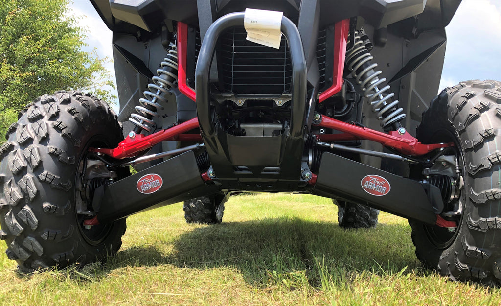 Break bad on the trail, ride the most buggy-busting terrain you can find - Trail Armor's a-arm guards can take the iMPACT!  Made of the same 1/2" Super Tough polymer we make our skid plates out of, these rear trailing guards follow the contours of the vehicle's trailing arms offering unbeatable protection for your trailing arms. Guards mount easily. All mounting hardware and simple photo-documented installation instructions are included. Fits the 2019 - 2022, 2024 Honda Talon 1000X, 2021 - 2024 Talon 1000X Fox Live Valve, 2020 - 2022, 2024 Talon 1000X-4, 2020 - 2024 Talon 1000 X-4 Fox Live Valve, 2023 Honda Talon 1000 XS, Talon 1000 XS Fox Live Valve, Talon 1000 XS-4 and Talon 1000 XS-4 Fox Live Valve Edition - trailing arm guards set of 2 only. Front Guards sold separately.  Note:  Because of limited space, these front guards are not engraved with Trail Armor on the front. This picture is for illustration purposes only of the tri-color effect.   See ALSO FITS chart in gallery for specific year and model fitment