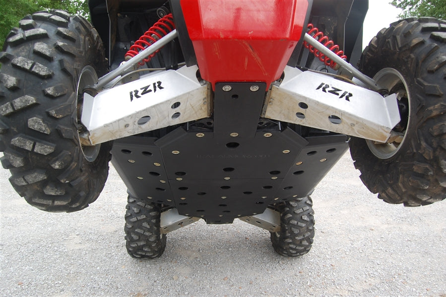 Get the best in under vehicle protection with Trail Armor's center skid plate set for the RZR 800, RZR 800 S and RZR XC. Made from 1/2" supertough polymer, these plastic skids absorbs shock to the bottom of the vehicle with no dents or rust and are lighter than traditional metal skids. Strategically placed drain holes allow dirt and debris to wash out - you don't have to remove them to clean out the belly your vehicle. They come in easy to install jointed sections that cover the full length of the vehicle with all hardware and instructions. Get complete coverage underneath with Trail Armor's RZR/RZRS nerf slider skids (shown in picture but sold separately). Fits through year model 2014. COLORS ARE CONSIDERED A SPECIAL ORDER AND ARE NON-RETURNABLE. THEY ARE NOT PIGMENT MATCHED TO ANY OEM MANUFACTURER'S COLOR SCHEME. PLEASE CONTACT US FOR ANY QUESTIONS ON MATCHING OR BLENDING WITH YOUR VEHICLE'S PLASTIC AND/OR GRAPHICS.