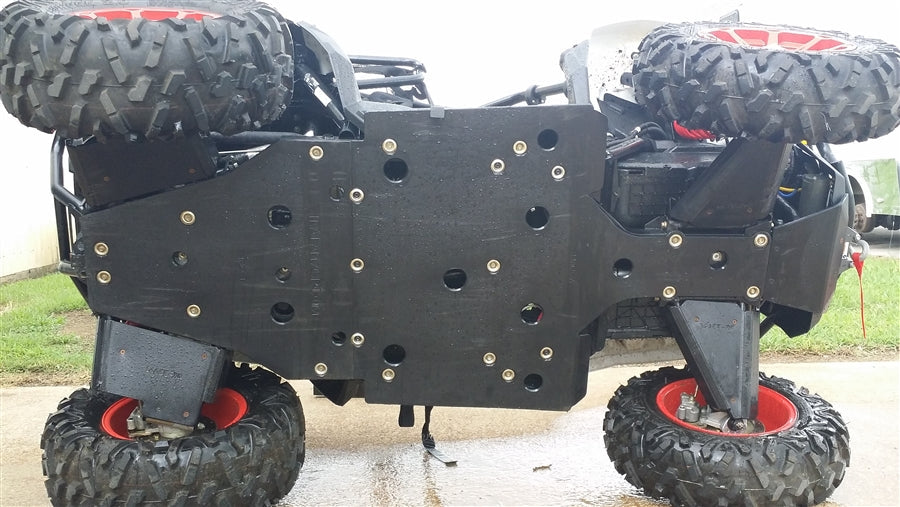 Get the best in under vehicle protection with Trail Armor's full skid plate set for the Polaris Sportsman ACE 325, 500, 570, 570 SP, 900 and 900 XC. Made from 1/2" supertough polymer, these plastic skids absorb shock to the bottom of the vehicle with no dents or rust and are lighter than traditional metal skids. Strategically placed drain holes allow dirt and debris to wash out - you don't have to remove them to clean out the belly your vehicle. They come in easy to install jointed sections that cover the full length and breadth of the vehicle, including the front and rear differential. Mounting hardware and instructions included. Ships UPS ground - no truck line needed! Fits Polaris Sportsman ACE beginning year 2014 - 2019. SEE ALSO FITS CHART BELOW for year specifics. Note: A-Arm guards shown in picture sold separately. Part #TA011ARMIMP-ACE.
