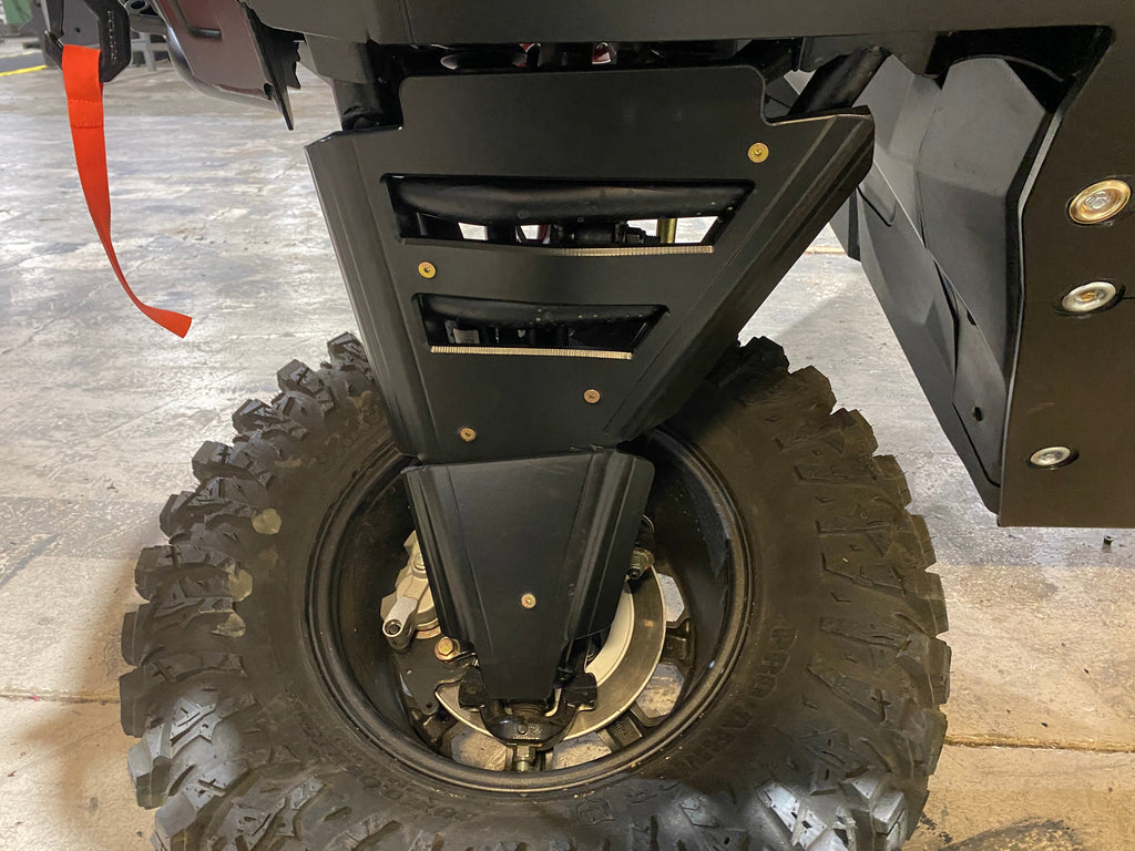 Hit the toughest, most challenging terrain with confidence—Trail Armor’s new A-Arm Guards are built to withstand serious impact. Made from the same ½" Super Tough material used in our skid plates, these guards stand out as the strongest, and most durable on the market. They offer three-sided protection for both your front and rear CV boots—covering front, rear, and bottom.  All mounting hardware and clear, photo-illustrated installation instructions are provided.   Refer to the Fitment Guide for exact compatibility with your year and model. Please note that colored options are special orders and cannot be returned. For inquiries regarding graphics or color choices, feel free to contact us. Due to size limitations, these guards cannot be engraved. The image displays the side profile for contrast reference.