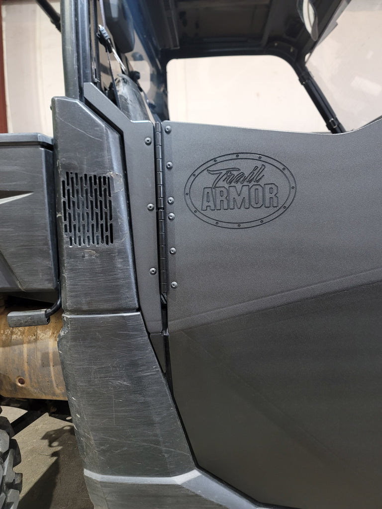 Trail Armor's half doors for the 2014 - 2019 Ranger XP 900, Ranger XP 1000 are made of a 5/8" solid high density plastic and requires NO DRILLING of your roll cage. The supplied filler panels enclose the rear opening for a factory-like fit and finish. New supplied strike plates mount on existing factory holes, with a two paw, two position rotary latch for a rattle free fit. All the brackets and hardware have durable powder coat and weather resistant black zinc finishes for a lasting, clean look. Unlike sheet metal door panels, our door panels will not rust, ding, or bend. Trail Armor doors open suicide for easy full extension entry/egress. The tight-fitting, slim-line profile allows for navigation in tight spots with nothing to hang on. Installs easily with photo-documented installation instructions. Lightweight and durable, these shields have the factory-like fit and finish that Trail Armor is known for. This product is designed and engineered to fit on stock cages, not guaranteed to work on aftermarket cages without modification. See ALSO FITS CHART in gallery for specific year and model fitment.