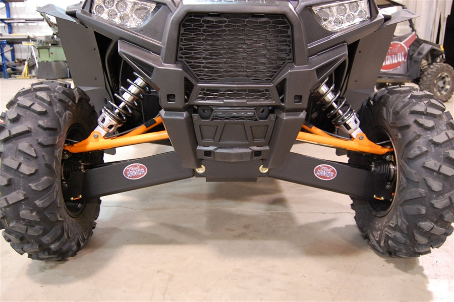 Break bad on the trail, ride the most buggy-busting terrain you can find - Trail Armor's a-arm guards can take the iMPACT! Made of the same 1/2" supertough polymer we make our skid plates out of, these are by far the toughest, best designed and coolest a-arms on the market. Guards have three sided protection of your front CV boots - front, rear and bottom - and mount easily with no drilling required. All mounting hardware and simple photo-documented installation instructions are included. Front guards set of 2 only. Trailing Arm Guards sold separately. NOTE: 64" vehicle COLORS ARE CONSIDERED A SPECIAL ORDER AND ARE NON-RETURNABLE. THEY ARE NOT PIGMENT MATCHED TO ANY OEM MANUFACTURER'S COLOR SCHEME. PLEASE CONTACT US FOR ANY QUESTIONS ON MATCHING OR BLENDING WITH YOUR VEHICLE'S PLASTIC AND/OR GRAPHICS. See ALSO FITS chart in gallery for specific year and models. WILL NOT FIT ANY ARCHED A-ARMS. Tricolor guards are engraved as shown in gallery. Solid color and black guards are not engraved.