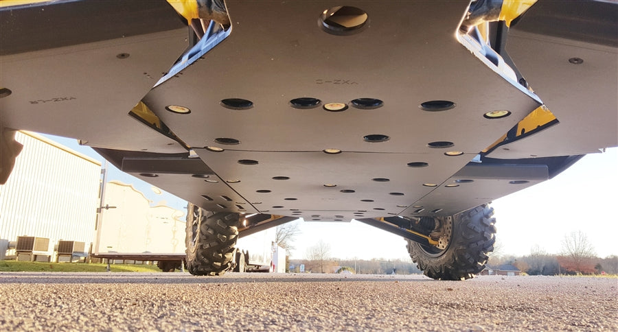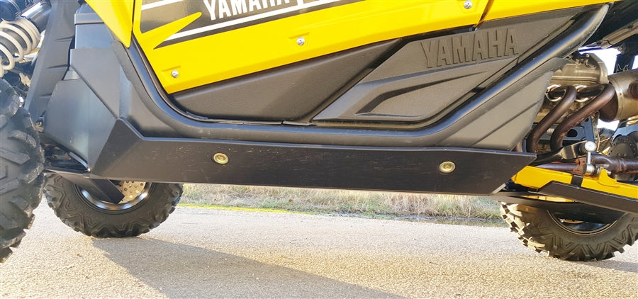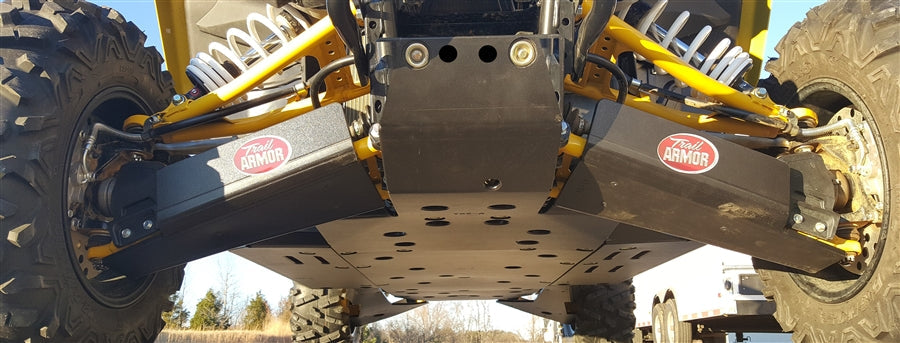 Get the best in under vehicle protection with Trail Armor's full skid plate with slider nerfs for the 2016 - 2025 Yamaha YXZ. Made from Super Tough polymer, these 1/2" plastic skids are lighter than most traditional metal/aluminum skid plates (see specs below) and because they have no "impact memory", they absorb shocks to the bottom of your vehicle without the dents, galling and corrosion of metal/aluminum skids. Trail Armor was the first in the industry to design skids with the formed leading edges (front and rear) featured on our skid plates. These leading edges protect vulnerable frame edges and wheel wells from blunt edge impacts and act as a starting edge to slide over obstacles without the resistance and drag of metal skid plates. Additionally, Trail Armor skids are designed with extended side panels bent to serve as slider nerfs which protect the vulnerable sides and rocker panels of your vehicle. Compare Trail Armor's skid set coverage with other skid manufacturer's like items - slider nerfs are either sold separately or the bottom skid coverage ends before the rocker panel, leaving this part of your vehicle unprotected. Trail Armor's skid plates come in easy to install panels that cover the full length and breadth of the vehicle, including the front and rear differential. These skids for the YXZ also include front and rear bash plates for added protection forward and aft AND an extended front panel that covers the radiator cowling - check other skid sets on the market and compare. Lap jointed panels create a continuous single smooth sliding surface - not stacked like other manufacturers skids with hard edges to create a catch point. Access holes to service points and oil drains make maintenance a breeze. Strategically placed drain holes allow dirt and debris to wash out - you don't have to remove them to clean out the belly your vehicle. However, if needed, individual panels may be removed to access different areas without removing the entire skid plate. Recessed mounting holes protect fasteners from damaging blows and keeping all bolt heads from protruding the skid's surface. All kits come with corrosion resistant hardware and photo-documented installation instructions. Installation videos, if available, are provided as a YouTube video on our site. Will work with Yamaha front and rear bumper. A-arm guards shown in picture are sold separately, see part # TA011ARMIMP-YXZ1000.  COLORS ARE CONSIDERED A SPECIAL ORDER AND ARE NON-RETURNABLE.  THEY ARE NOT PIGMENT MATCHED TO ANY OEM MANUFACTURER'S COLOR SCHEME.  PLEASE CONTACT US FOR ANY QUESTIONS ON MATCHING OR BLENDING WITH YOUR VEHICLE'S PLASTIC AND/OR GRAPHICS.  See ALSO FITS chart in gallery for specific year and model fitment.